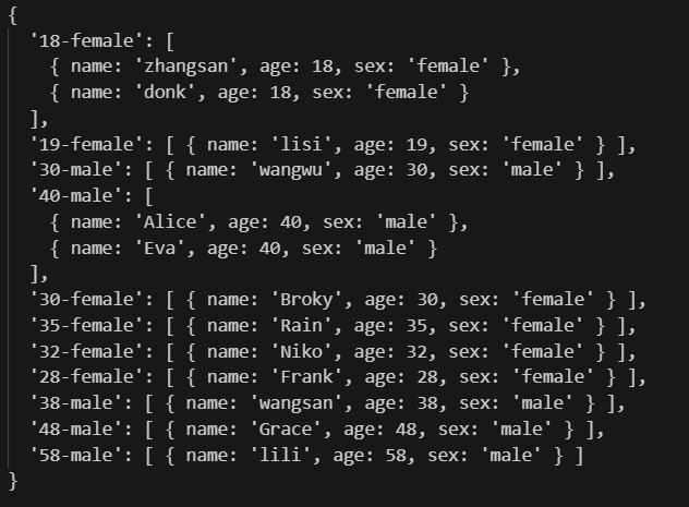 将数组和分类属性作为参数传入,那么这段代码就具备一定的通用性了,但是还是不够完美,如果我们是其他数组呢,数字数组,组合分组,那么这个函数的通用性其实是不够的,所以还需要优化,我们再看一下上面这个函数,去思考一下,哪些参数是关键的,用于分组的键。